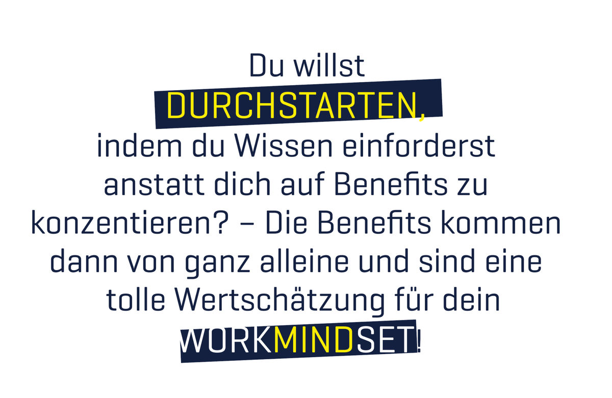 Daher gilt bei uns: Durchstarten, indem du Wissen einforderst, anstatt dich auf Benefits zu konzentrieren – die Benefits kommen dann von ganz alleine und sind eine tolle Wertschätzung für dein WorkMindSet!